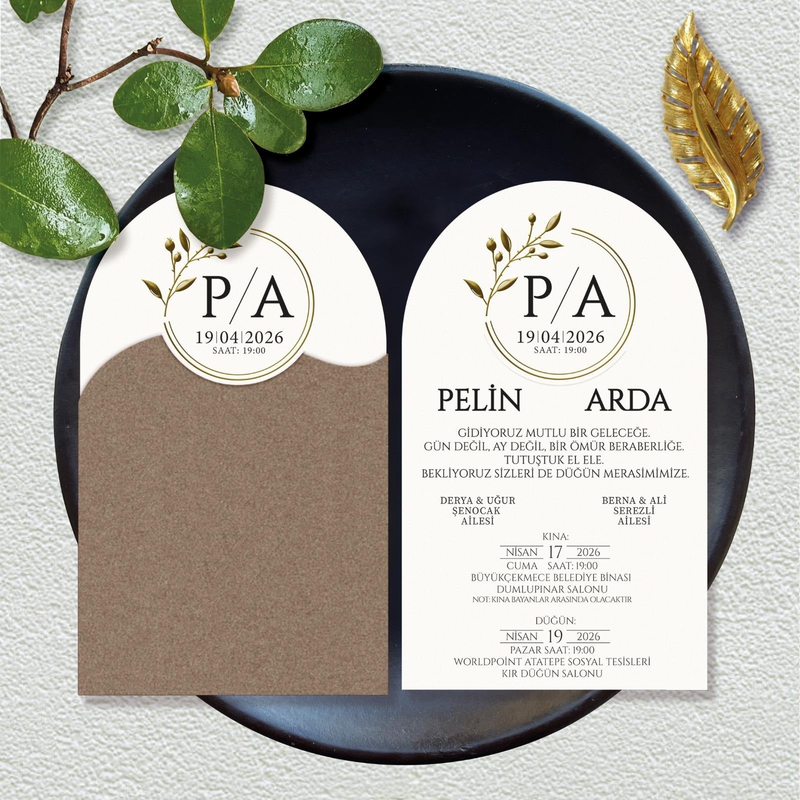 Halbrund gestanzte Karte in geschwungen gestanztem Schuber aus Kraftpapier